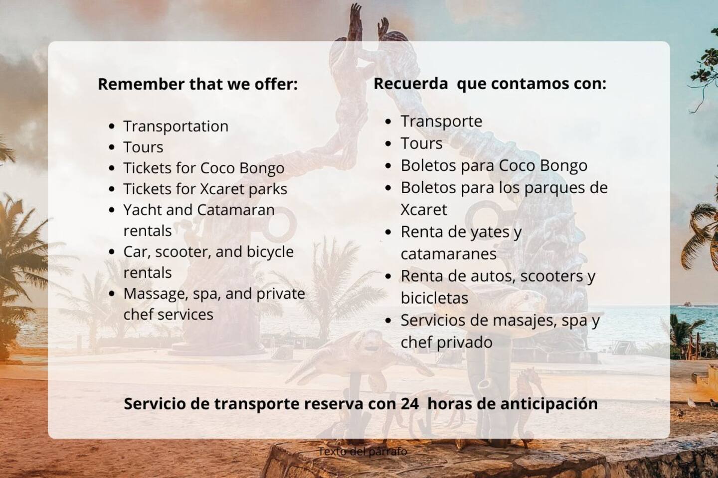 Servicios adicionales para tu comodidad: 🛎️ Atención Personalizada 24/7: Estamos a tu disposición en cualquier momento para resolver dudas, ofrecer recomendaciones locales o coordinar tus necesidades, garantizando una estancia sin preocupaciones. 🚖 Transporte Privado: Ofrecemos traslados privados desde y hacia el aeropuerto de Cancún, asegurando un viaje cómodo, seguro y sin estrés. Nuestros conductores expertos te llevarán a cualquier destino 🌴 Tours y Experiencias Personalizadas: Descubre la magia de la Riviera Maya con nuestros tours privados, diseñados para explorar destinos icónicos como las ruinas mayas de Tulum y Chichen Itza, los cristalinos cenotes y las playas más hermosas. También organizamos visitas a parques temáticos como Xcaret y Xel-Há, donde podrás disfrutar de la naturaleza y la cultura local. 🎟️ Tickets a Parques y Atracciones: Facilitamos la compra de entradas para las atracciones más populares, como Xcaret, Xel-Há, Selvatica y más, para que planifiques tu aventura sin complicaciones y aproveches al máximo tu tiempo. Contáctanos para personalizar tu experiencia o reservar estos servicios. ¡Haz que tu viaje a la Riviera Maya sea inolvidable!